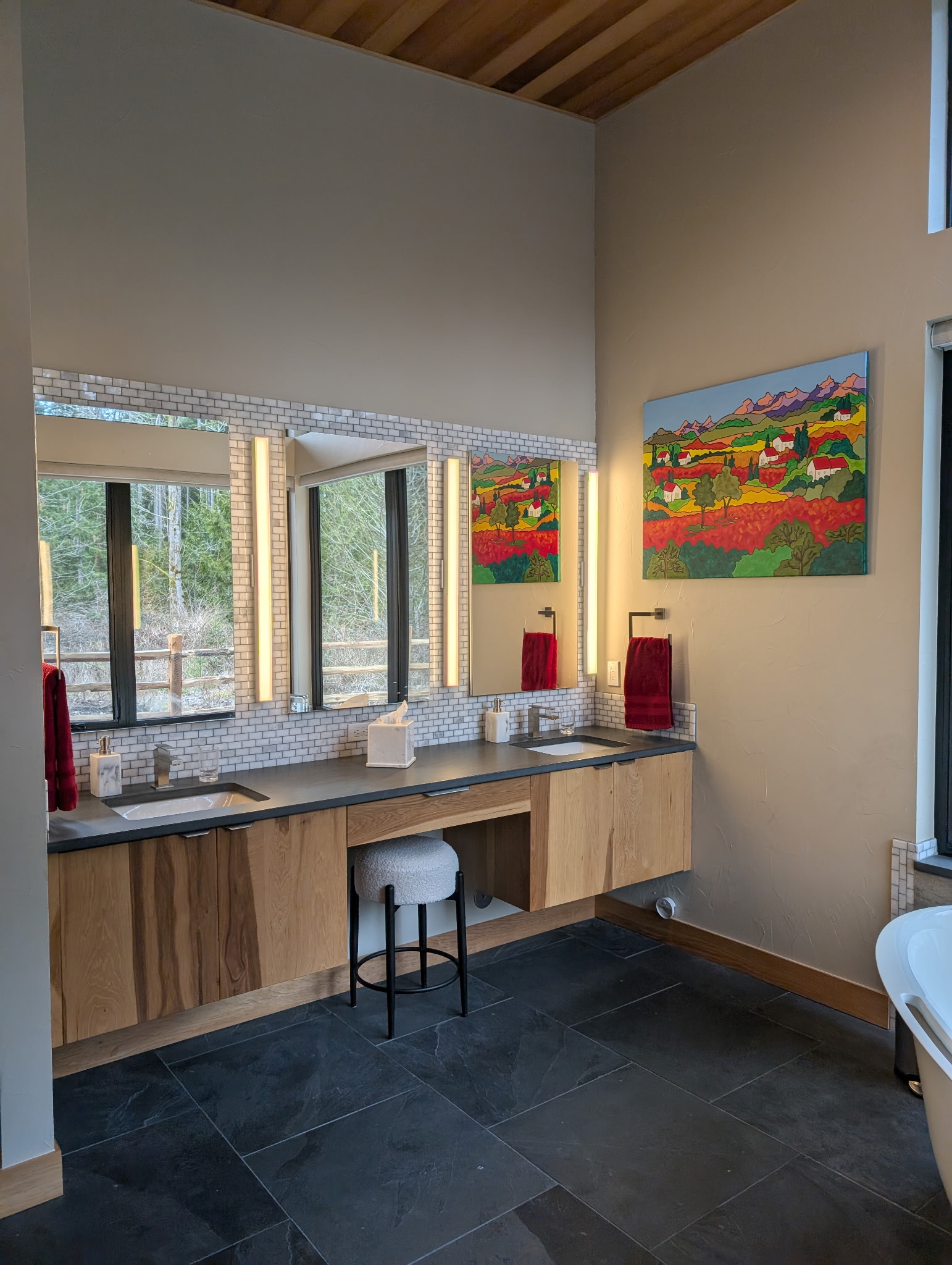 This is one of my favorite bathrooms to date. The floors are real slate tile, the cabinets are solid hickory, the ceiling is hemlock tongue and groove, and the countertop is a dark granite.